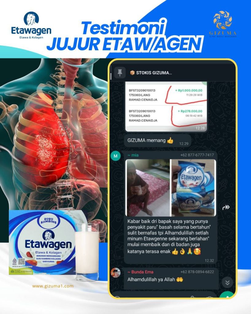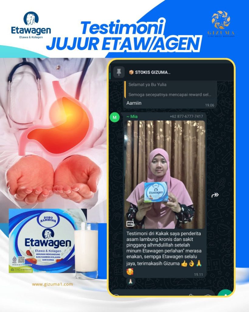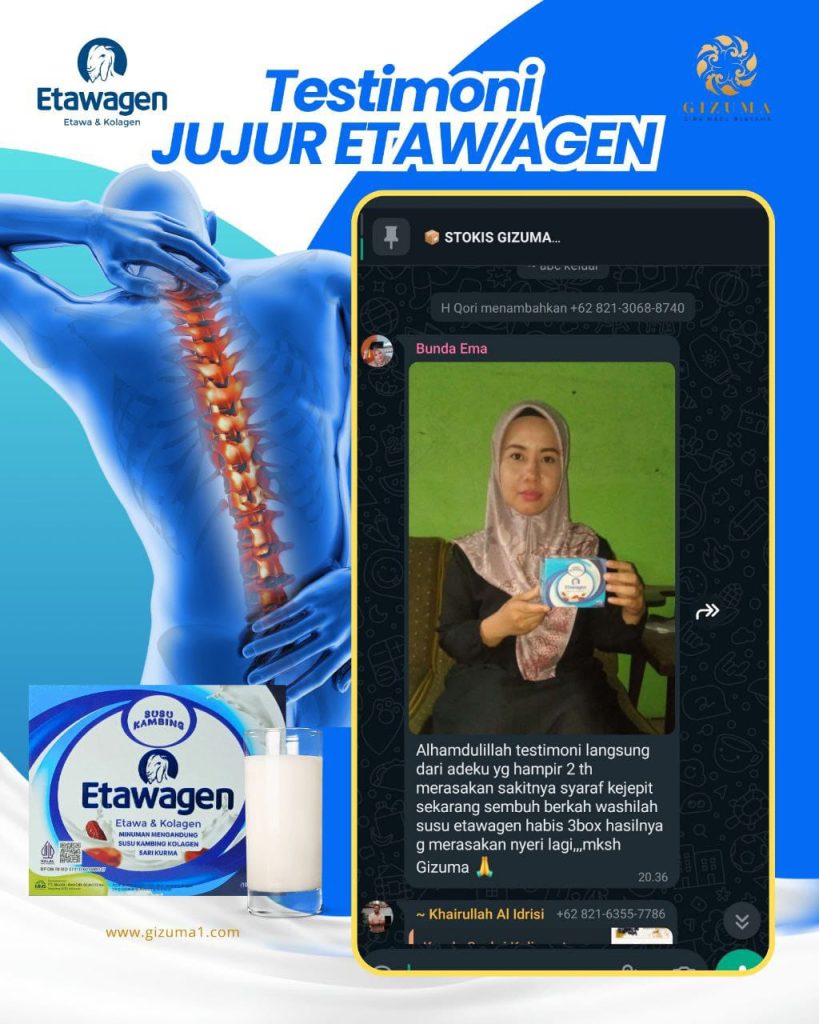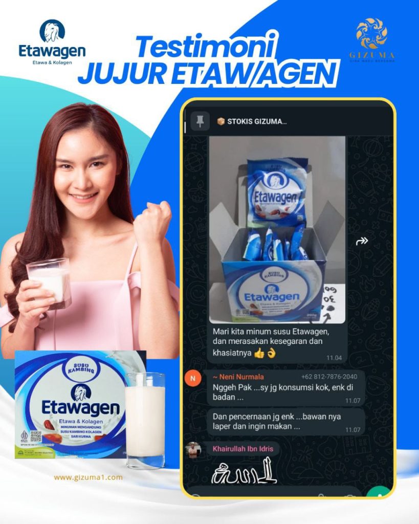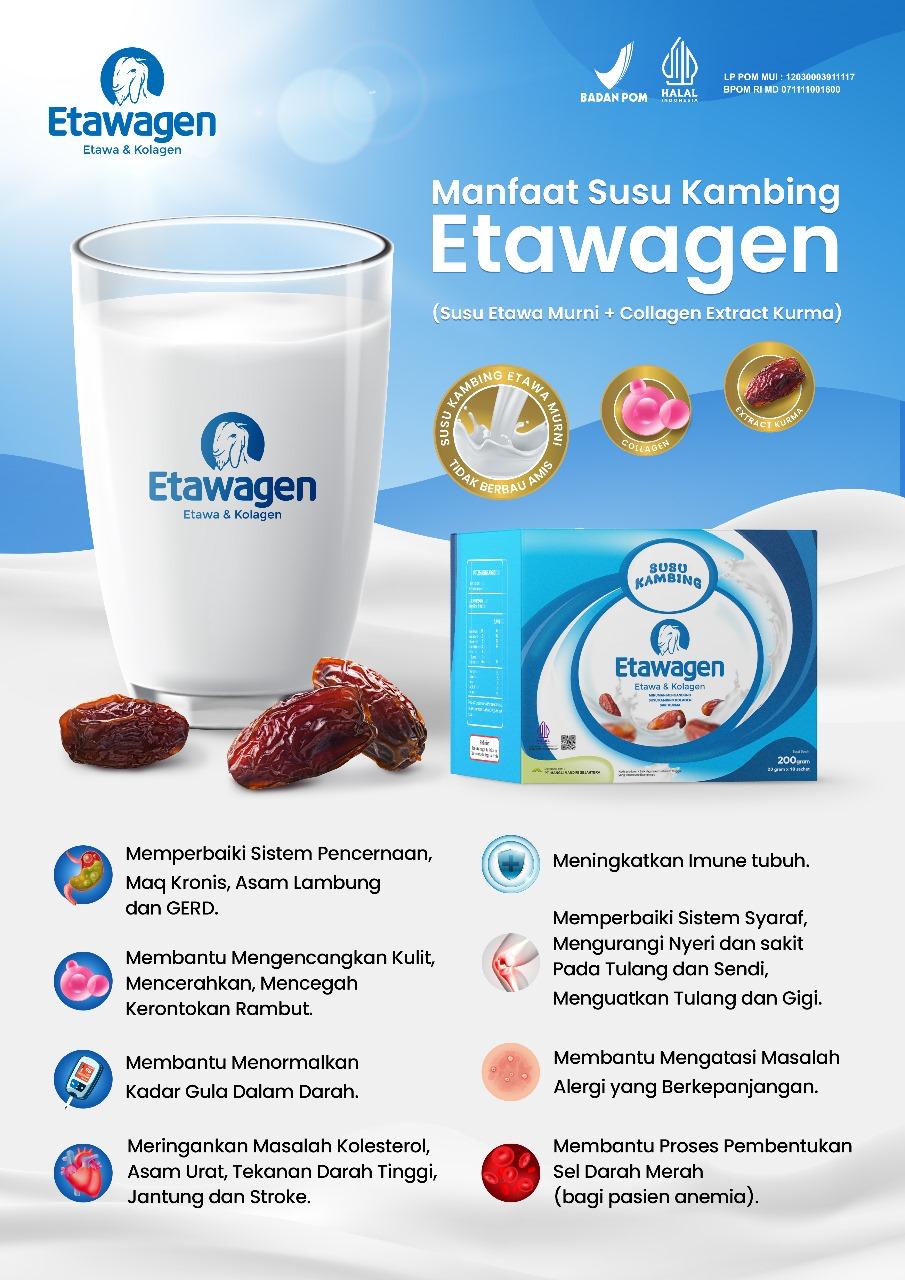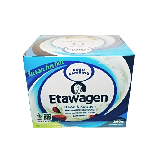 ETWAGEN merupakan minuman kesehatan premium yang 100% alami, aman, dan halal. Minuman herbal ini berisi susu etawa,collagen dan sari kurma.